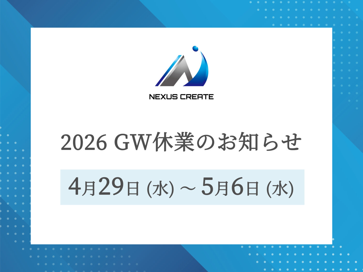 誠に勝手ながら、下記の期間をGW休業とさせていただきます。